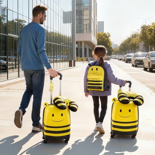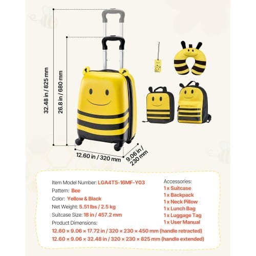 Pattern: Bee ,Color: Yellow & Black,Item Model Number:LGA4T5-16MF-Y03,Set Count: 5 pieces (Suitcase + Backpack + NeckPillow + Lunch Bag + Luggage Tag),Product Dimensions: 12.60 x 9.06x 17.72 in/320 x 230 x 450 mm (handle retracted); 12.60 x 9.06 x32.48 in/320 x 230 x 825 mm (handle extended),Suitcase Size: 18 in/ 457.2 mm,Net Weight: 5.51 lbs / 2.5 kg